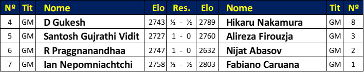 Os líderes mantiveram suas posições com empates no GM Fabiano Caruana-Nepomniachtchi e no Gukesh-GM Hikaru Nakamura. Tanto Vidit quanto Praggnanandhaa, que não haviam vencido no dia anterior, converteram vantagens de forma estelar desta vez.