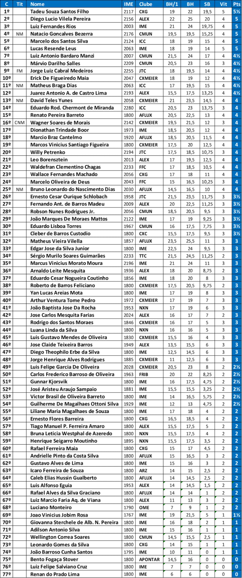 Campeão absoluto: Tadeu Souza Santos Filho (CXG) – com impressionantes 5,5 pontos, dominando o tabuleiro com precisão cirúrgica e espírito competitivo exemplar.